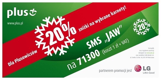 W połowie stycznia w ośrodku Jaworzyna Krynicka wystartowała akcja "Zimowe sms-ki 2013". Do końca sezonu narciarskiego abonenci sieci PLUS GSM mogą otrzymać nawet 20% zniżki na karnet 4-godzinny lub karnet obowiązujący w godzinach 9:00 -15:00 (dotyczy karnetów normalnych, nie ulgowych). Wystarczy wysłać smsa o treści "JAW" pod numer 71300, a otrzymany kod pokazać w kasie biletowej nr 1 ośrodka narciarskiego. To idealne rozwiązanie na wszystkich narciarzy i snowboardzistów, które pozwoli nam trochę zaoszczędzić :)